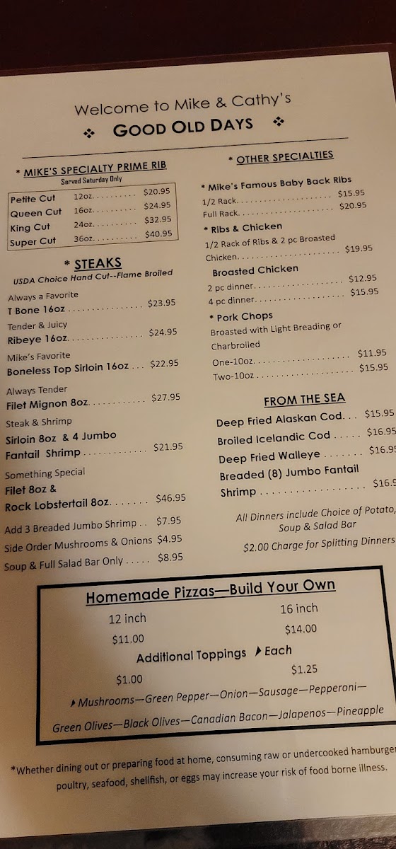Step into a place where comfort food meets nostalgia at Mike & Cathy's Good Old Days Menu. Nestled on W995 W North Shore Dr in Montello, WI, this charming spot serves up a menu full of hearty, home-cooked meals that’ll make you feel right at home. From juicy burgers to flavorful sandwiches, each dish is crafted with love and care. The warmth of the atmosphere complements the satisfying food, making it the perfect place to gather with friends and family for a relaxed meal. Whether you’re craving a classic breakfast, a filling lunch, or something sweet to end your day, Mike & Cathy's Good Old Days Menu has something for everyone. Take a seat, unwind, and let the comforting flavors take you back to simpler times.